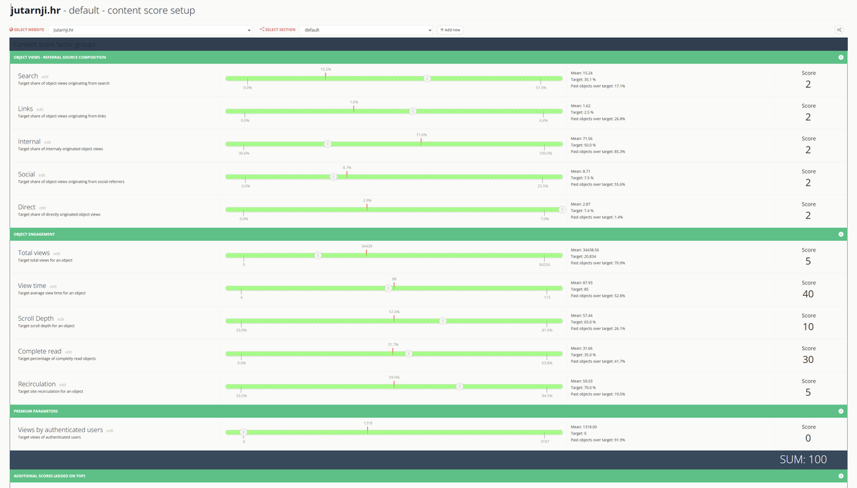 Ponderirani Content Score (CS) mjeri kakav signal kvalitete Discover prima iz najvidljivijeg dijela feeda. U izračun ulaze CS vrijednosti prvih 10 članaka, pri čemu se svaki članak ponderira prema svojoj poziciji – sadržaj u vrhu feeda ima veći utjecaj na ukupni signal od sadržaja niže u listi.